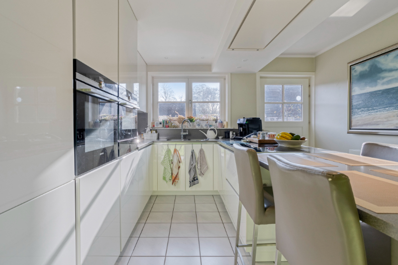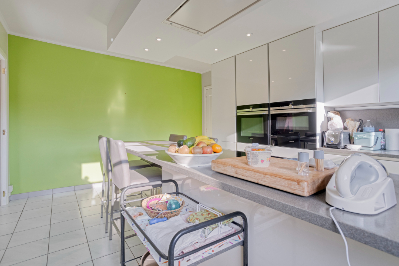 - Hyper-geïnstalleerde keuken met hoogwaardige afwerking (glanslak) en toestellen: frigo, diepvriezer, oven, microgolfoven, bordenverwarmer, inductiekookplaat, dampkap en vaatwasser