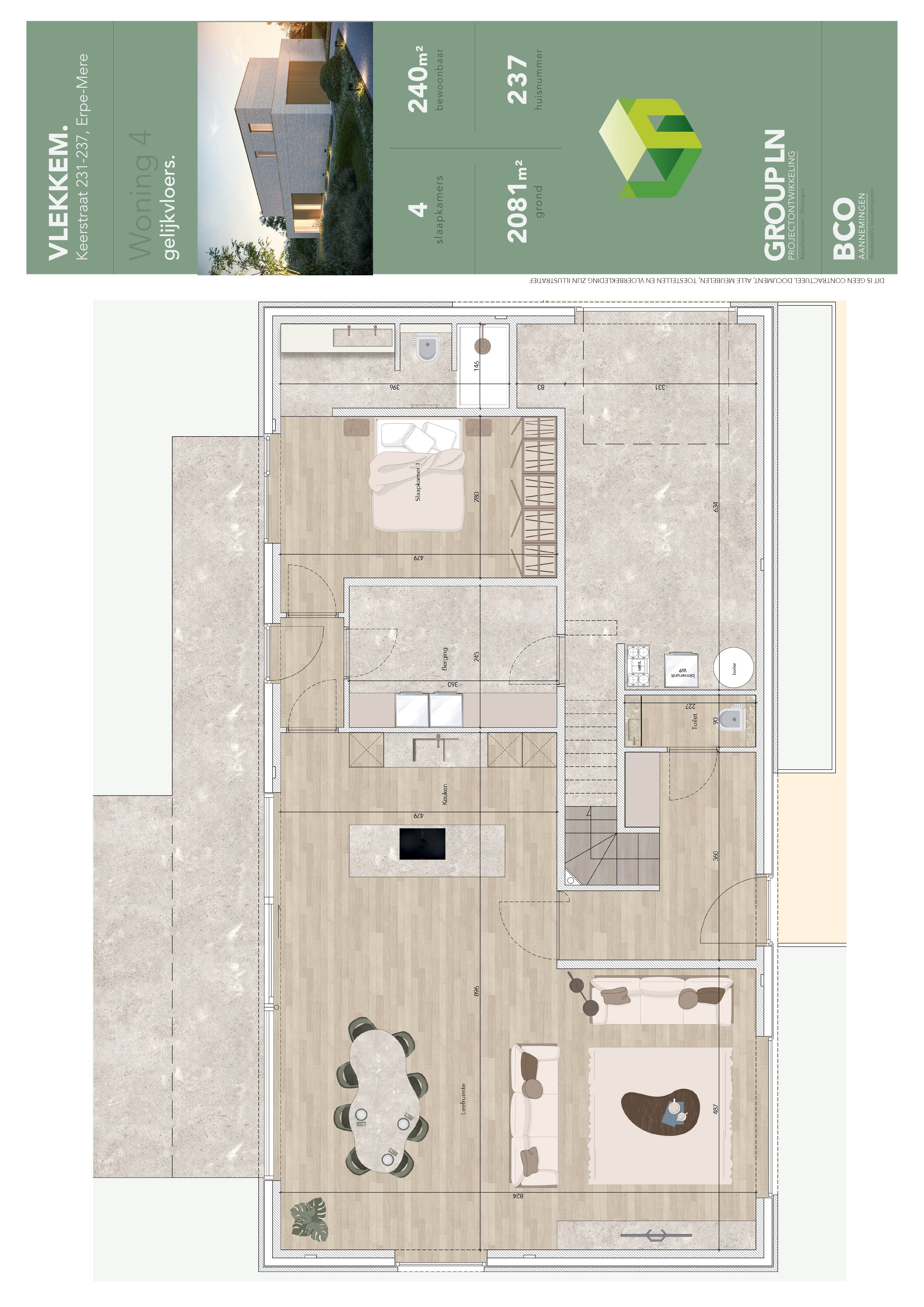 Deze open moderne villa (woning 4) is gebouwd volgens de BEN-normen en heeft een bewoonbare oppervlakte van 240m² en een perceeloppervlakte van 2081m².