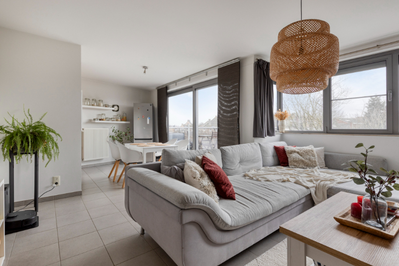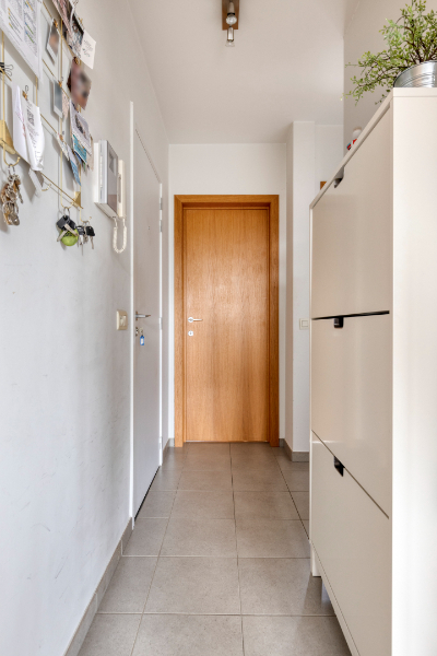 Bij binnenkomst kom je in de inkomhal met toegang tot de verschillende ruimtes. De lichtrijke leefruimte vormt het hart van het appartement en sluit naadloos aan op het terras.